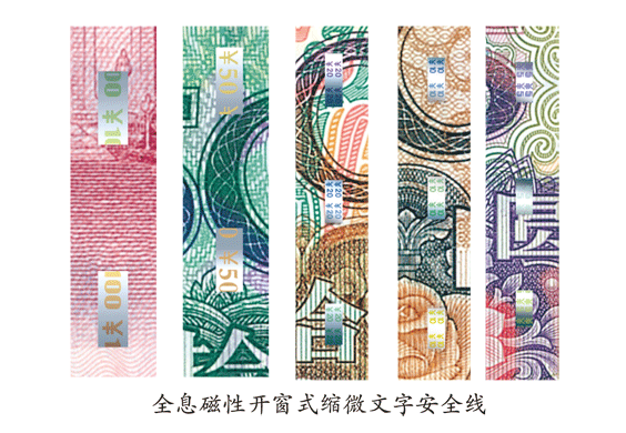 人民币从第四套1990年版开始运用安全线这项防伪技术,1990年版50元、100元,使用普通全埋式安全线。第五套1999年版的安全线,开始加印缩微文字和全息文字。100元、50元为磁性缩微文字安全线,20元为磁性间断式安全线(无字),10元和5元首次使用全息磁性开窗式安全线。安全线的植入方式由全埋式改为开窗式,所谓开窗,是指线体材料等距间断埋入纸中和裸露在纸表面;材料由单一的聚酯材料改为有闪光效果的复合材料。